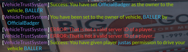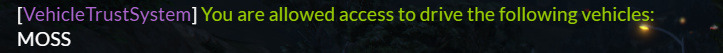 /trust [playerID] [spawncode] = Trust the specified player to your vehicle if you own it.